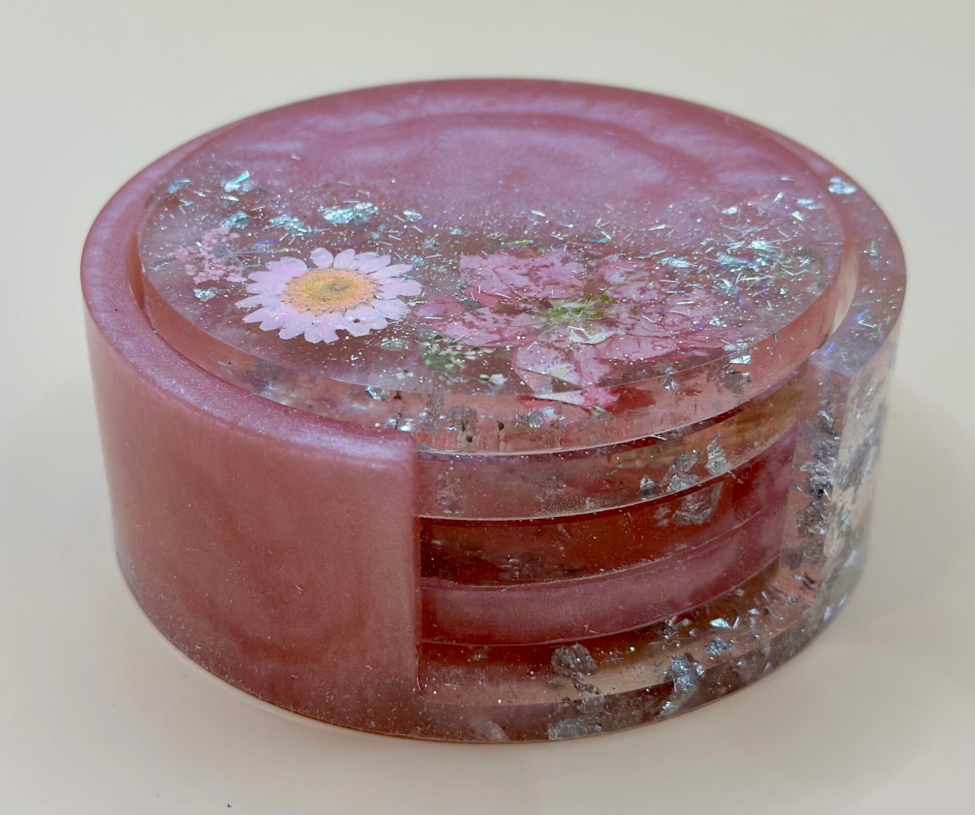Roze met zilveren glitters en gedroogde bloemen setje onderleggers en houder